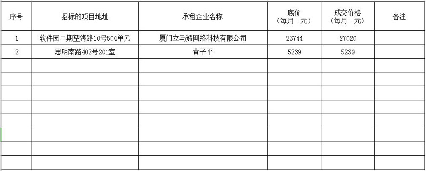 根據(jù)思明區(qū)國(guó)有企業(yè)資產(chǎn)出租管理的相關(guān)制度,我司2019年11月18日上午9:00起于觀音山營(yíng)運(yùn)中心2號(hào)樓2層2號(hào)會(huì)議室進(jìn)行公開(kāi)招租現(xiàn)場(chǎng)開(kāi)標(biāo),現(xiàn)通過(guò)思明控股網(wǎng)站對(duì)外發(fā)布成交公告,內(nèi)容如下: