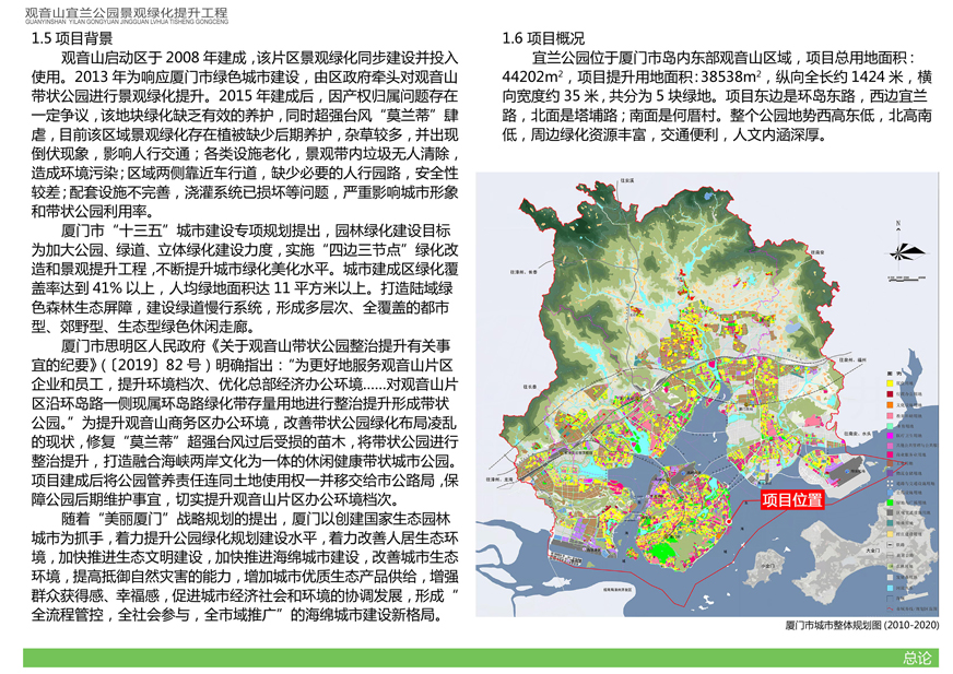 為切實改善上述問題,提升觀音山片區(qū)辦公環(huán)境檔次,廈門市開元國有投資集團有限公司擬對觀音山宜蘭公園進行綠化提升,并委托廈門市城邦園林規(guī)劃設計研究院有限公司進行了方案設計。根據(jù)廈府辦[2019]115號文要求,現(xiàn)將設計方案予以公布并廣泛征求意見。
