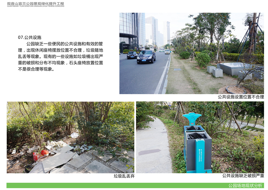 項目位于環(huán)島東路與觀音山商務營運中心之間,緊鄰城市干道環(huán)島東路及市政道路宜蘭路。該區(qū)域景觀綠化目前存在植被缺少后期養(yǎng)護,雜草較多,并出現(xiàn)倒伏現(xiàn)象,影響人行交通;各類設施老化,景觀帶內(nèi)垃圾無人清除,造成環(huán)境污染;區(qū)域兩側(cè)靠近車行道,缺少必要的人行園路,安全性較差;配套設施不完善,澆灌系統(tǒng)布局不合理等問題,嚴重影響城市形象,因此對現(xiàn)狀綠化進行整治十分必要。