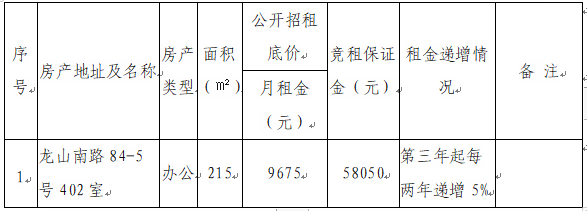 根據(jù)國(guó)有企業(yè)資產(chǎn)出租管理相關(guān)制度,我司決定對(duì)位于龍山南路84-5號(hào)402室房產(chǎn)對(duì)符合入駐條件的意向承租人進(jìn)行公開競(jìng)價(jià)招租,具體信息如下: