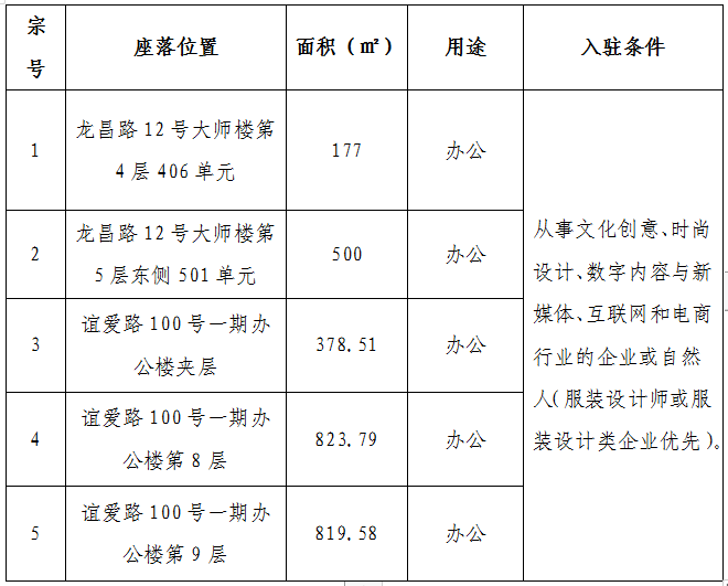 根據(jù)國(guó)有企業(yè)資產(chǎn)出租管理相關(guān)制度,我司決定對(duì)位于龍昌路12號(hào)、誼愛(ài)路100號(hào)嘉蓮商務(wù)中心下列5宗房產(chǎn)對(duì)符合入駐條件的意向承租人進(jìn)行公開(kāi)競(jìng)價(jià)招租,具體信息如下: