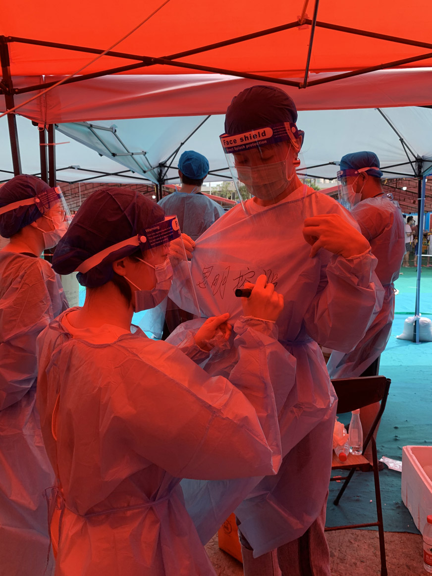 夜幕降臨,當(dāng)日的檢測工作也接近尾聲。吹著初秋的晚風(fēng),看繁星閃爍。脫下悶熱的隔離衣,卸下了一天的防備。看著彼此被勒出痕跡的臉龐和手套下發(fā)白發(fā)皺的雙手,我們更加堅(jiān)定了殲滅疫情的決心。