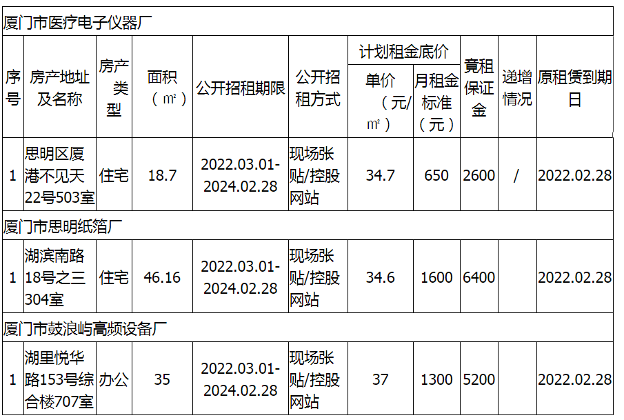 思明區(qū)屬托管企業(yè)出租房產招租公告(2022年1-3月)