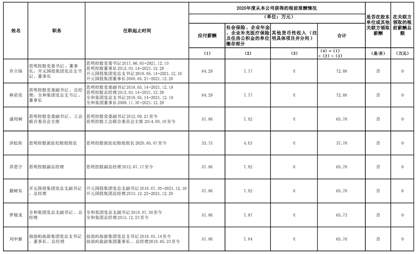 1.上表披露薪酬為廈門思明國有控股集團(tuán)有限公司及三家二級公司企業(yè)負(fù)責(zé)人2020年度全部應(yīng)發(fā)稅前薪酬,不含三年任期激勵。