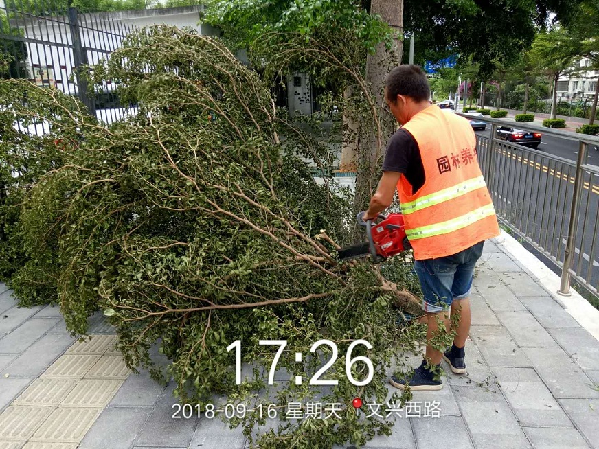 9月15日上午,氣象局發(fā)布“臺風預警Ⅲ級”,我司迅速響應,綠化部人員第一時間抵達一線,確保隊伍、設備以及防護措施全部準備就緒。同時,組織工作人員對轄區(qū)內(nèi)淺根系、樹冠龐大、枝葉過密的園林植物進行重點排查,同步采取疏枝、立柱、綁扎、培土等防御措施,減少樹木應對臺風的受力面積,使防風支架起到更好的支撐和保護作用。本次應急搶險,我司共投入人力212人次,搶險機動車35部,加固樹木182棵,修剪樹木725棵,扶正倒樹傾斜樹29棵,對200多棵樹木的折枝進行鋸除清理。